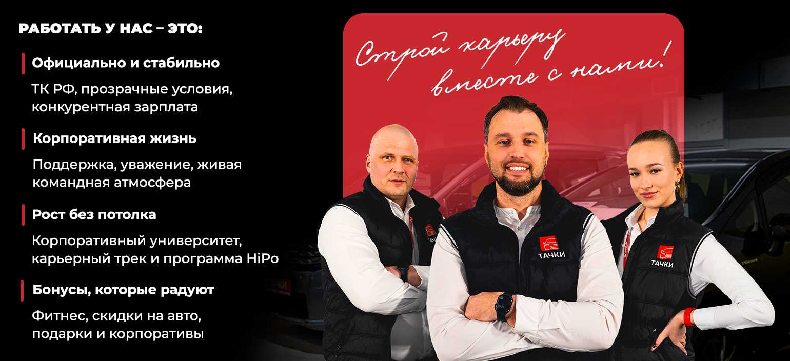В компании «ТАЧКИ» два главных актива: крутые автомобили и сильные специалисты. Ищем тех, кто хочет развиваться вместе с лидером отрасли и быть частью команды профессионалов.